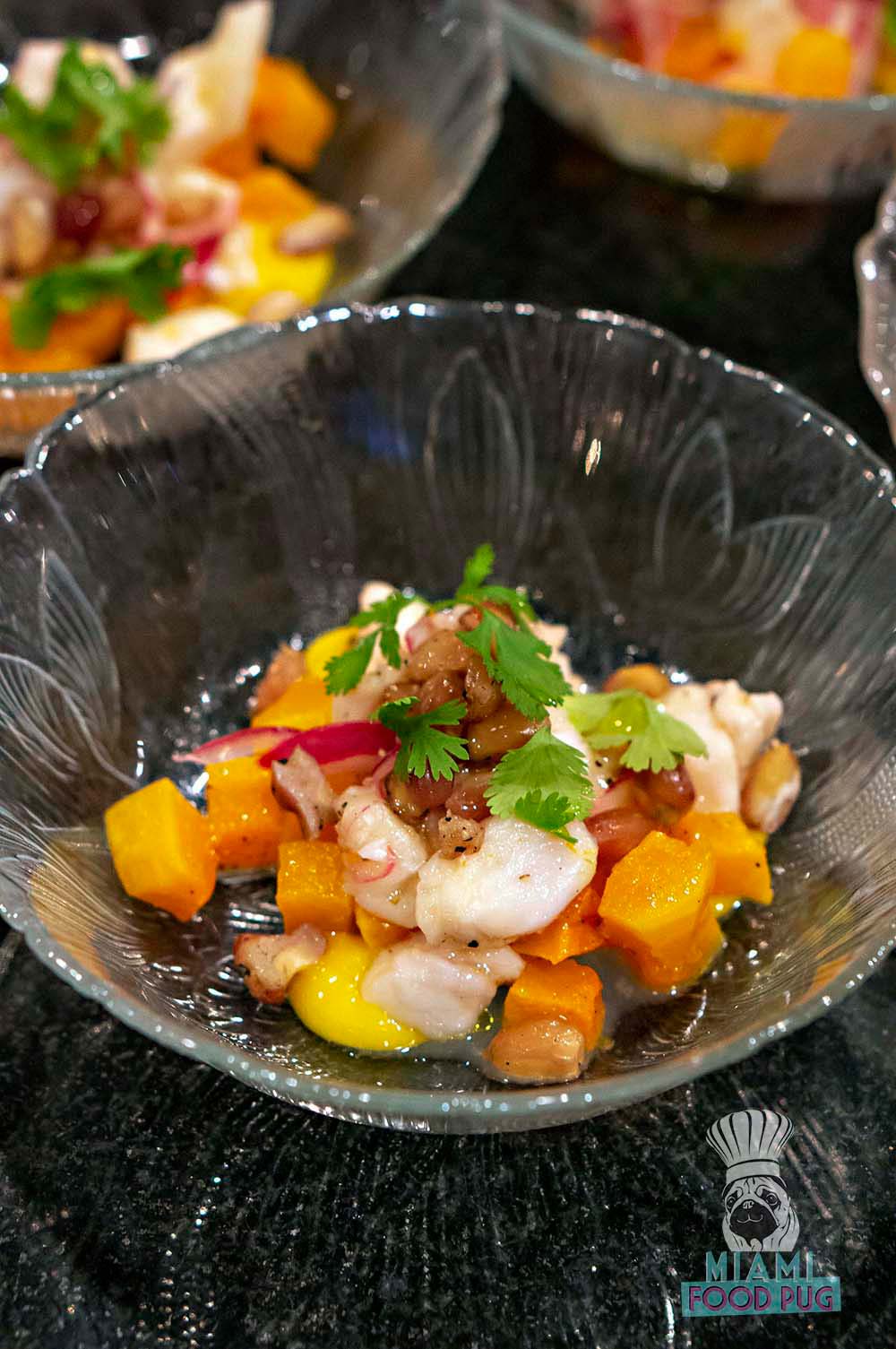 - Black Grouper Ceviche, Seminole Pumpkin, Red Corn Hominy, Local Mango