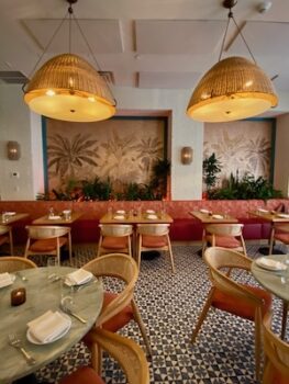 Inside, it feels like stepping into your own backyard: palm trees and lush greenery frame the space, walls are adorned with Haitian-inspired artwork, striped umbrellas provide shade, while bright pink domino tables and yellow lounge seating surround a laid-back bar – together creating a joyful, open atmosphere. As the sun sets, the space seamlessly transforms from a serene daytime escape into an energetic nighttime destination.